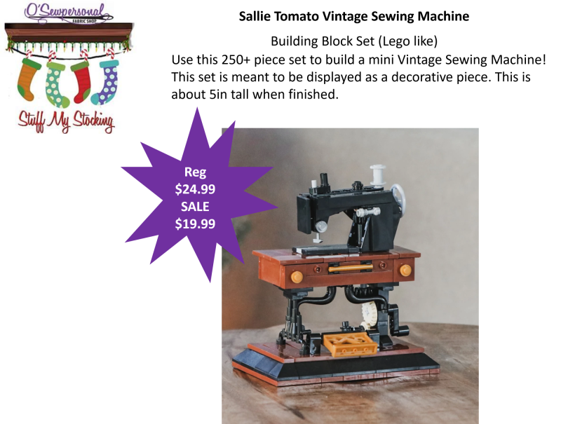 Each day for 12 days straight, we will send out an email before 7am with a special item you can buy for ONE DAY only! You can choose to buy every item or just a few. However, you have to order by midnight each day. At the end of the 12 days we will bag up your items in a pretty packaging and you can pick your items up at either OSewpersonal location after Dec 17th.
