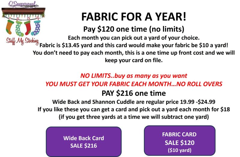 Each day for 12 days straight, we will send out an email before 7am with a special item you can buy for ONE DAY only! You can choose to buy every item or just a few. However, you have to order by midnight each day. At the end of the 12 days we will bag up your items in a pretty packaging and you can pick your items up at either OSewpersonal location after Dec 17th.