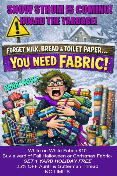 Yes it is chilly, but the roads are still clear to head to the shop and stock up on your weekend project. You might have tons of fabric but no background fabric to work with. Plus now is a great time to be thinking about your holiday projects for 2026. We have a LARGE selection of Fall, Christmas and Halloween to pick from. If you buy a yard you get a yard free. No limits and you can pick and choose your free holiday fabric.